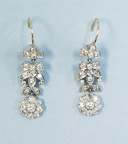 A pair of attractive 18 kt. gold and platinum pendant earrings. Set with an arrangement of floral ornaments. Total diamond weight appx. 1.75 cts.