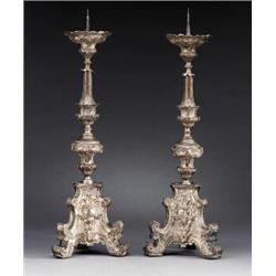 A pair of baroque silvered copper CHURCH, A pair of baroque silvered copper CHURCH CANDLESTICKS...