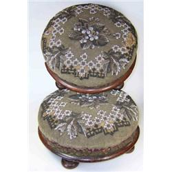 A pair of beadwork mahogany footstools, the floral covers of the stuffed tops fixed to the mahogany.