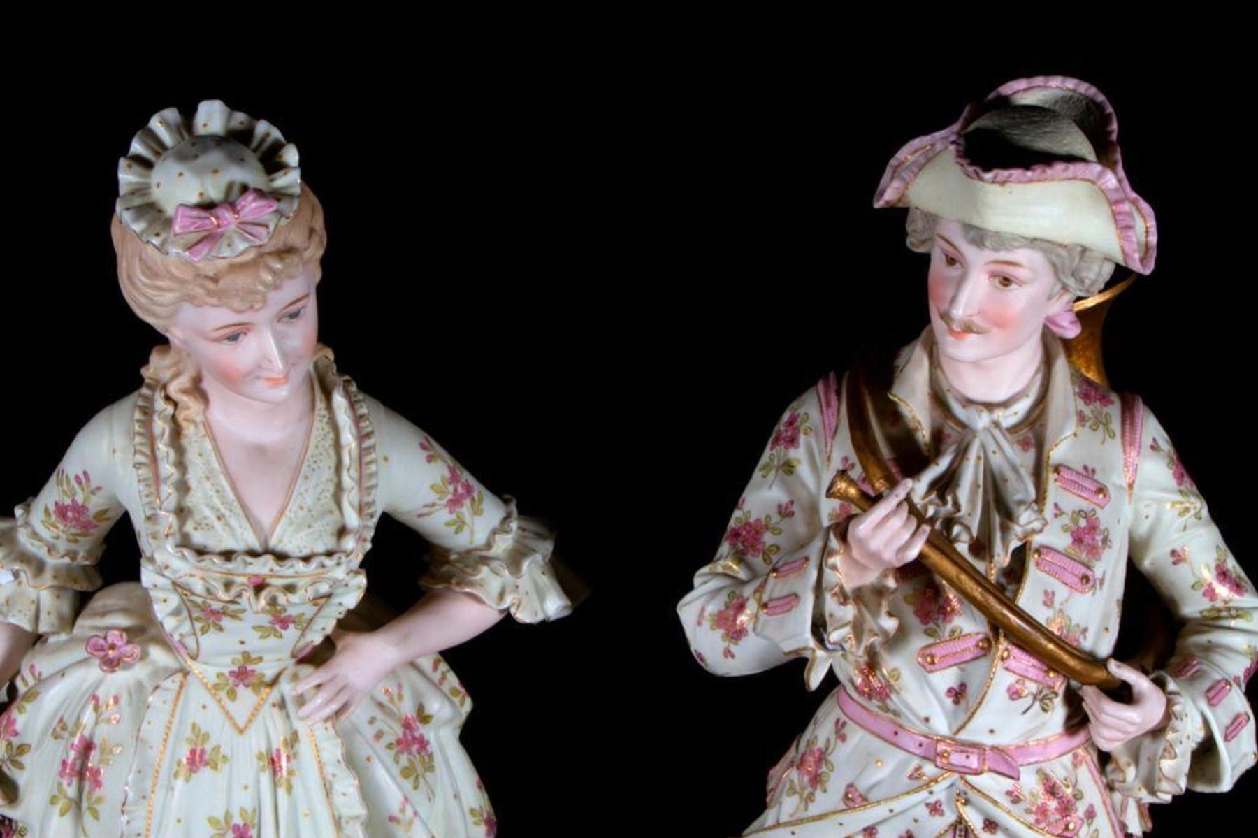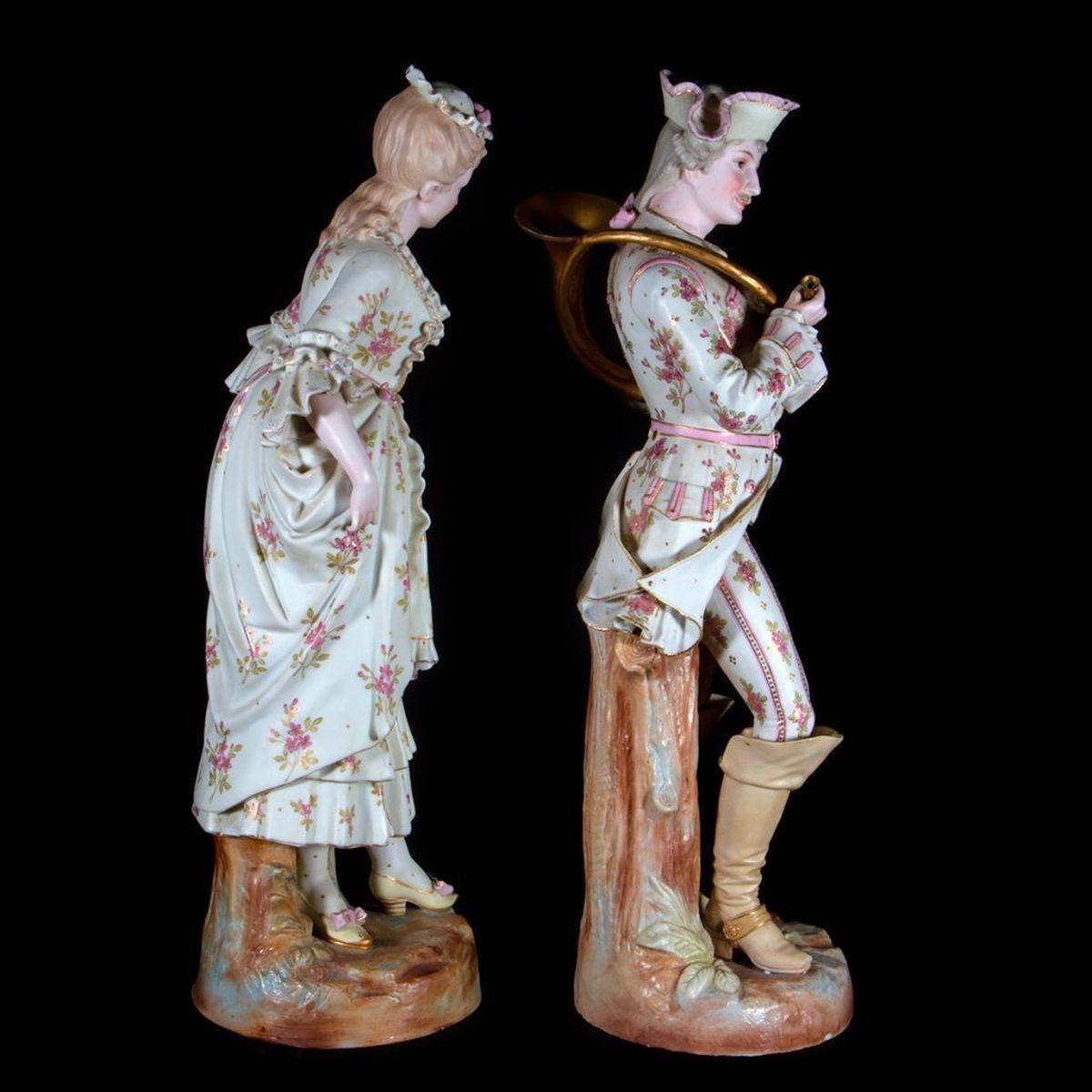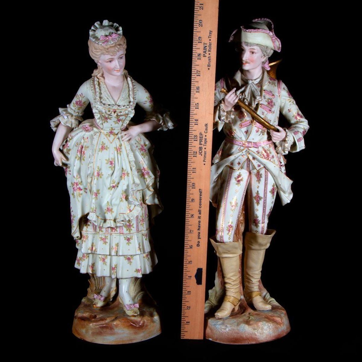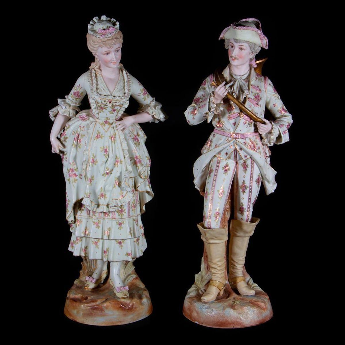 A pair of Continental bisque figures. H- 201/2" W- 8 1/2" D- 61/2". Condition: Good, loss to lady's finger.