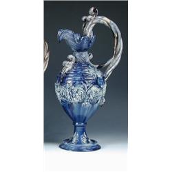 A pair of blue baluster ewers, each with feather incised petal spouts and mauve rope handles with triple curlicue thumbpieces, stellate leaves applied to the ribbed shoulders and foot, bands of foliage rinceaux between, castle sprig marks, 35.5cm high (D) (2) £150-200