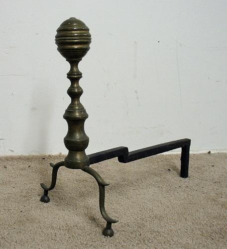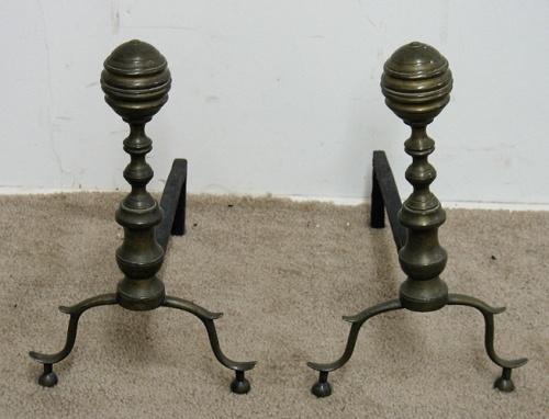 A pair of brass andirons; turned standards; ball feet; mid 19th C.; measures 15" high (no visible defects)