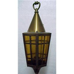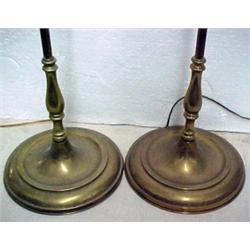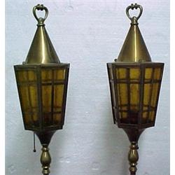A pair of brass torchieres, loop finials on cone shaped tops over amber glass paneled shades with brass fretwork, round standards with turned decoration at top, mid length and bottom of standard, on round bases, early to mid 20th C., approximately 70" high Estimate 150/300