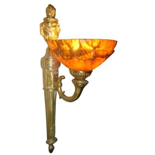 The artwork of the casted bronze of this pair of alabaster stone sconces make this item unique.Shipping cost within USA: 75.00. Some assembling may be required. They were rewired to USA standards.Due to the nature of alabaster stone the pictures may not accurately represented the color and pattern of the alabasterIt will take 4 to 5 weeks to deliver