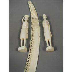 A pair of carved ivory African figures and a large tusk size carving, decorated with graduated elephants, height of figures 24.5cm, length of tusk knife 79cm Est. 150/200