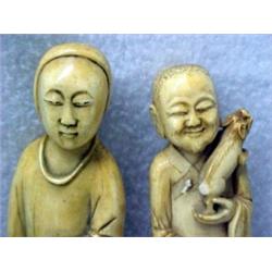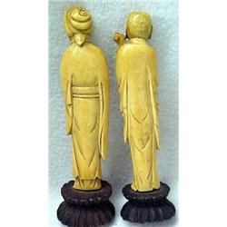 A pair of carved ivory Japanese figures on wooden stands, man holding foo dog and chain (loss to dog's tail), and woman with basket, 19th C., each measures approximately 7 3/4" high Estimate 300/700