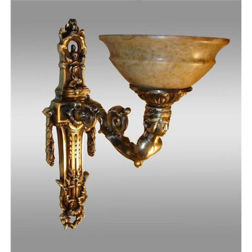 Handcrafted real alabaster stone and bronze was used for this item, glass and plastic supplanted alabaster in the construction of light fixtures. </em></td>