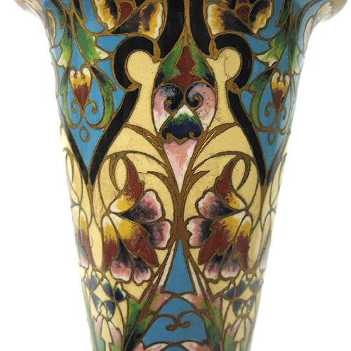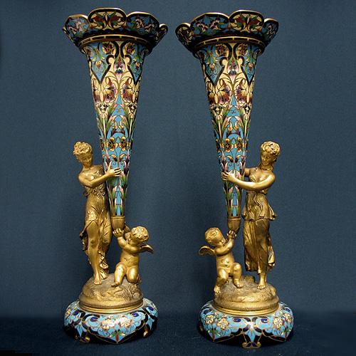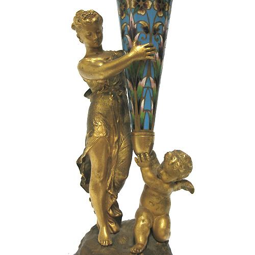 A pair of champleve figural mantle vases; each with gilt bronze figures of a woman in draped clothing and cherub; holding a trumpet form champleve vase; enameled base; gilt bronze interior; late 19th C.; 14" high (no visible defects)