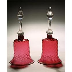 A pair of cranberry models of hand-bells, spirally fluted and applied with an opaque-white rim, fitted with clear verically fluted handles with cushion-knop finials, 29cm high, late 19th century (both lack clappers) (see illustration) £300-500