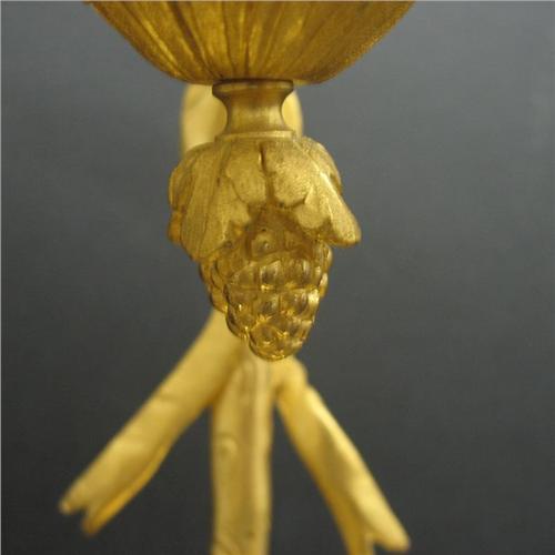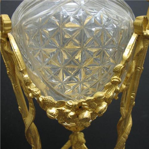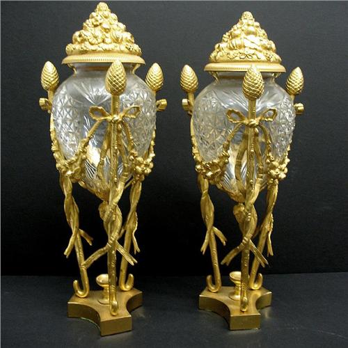A pair of crystal and bronze dore lidded urns in stands; floral repousse cone-shaped lids on fitted mountings; cut crystal egg-shaped jars with pine cone finials and drop finials; each in fitted three-legged stand with swag and ribbon decoration; early 20th C.; 15 1/2" high; with 1999 receipt from Antique Showcase of Philadelphia, 1607 Pine Street in Philadelphia; no visible defects