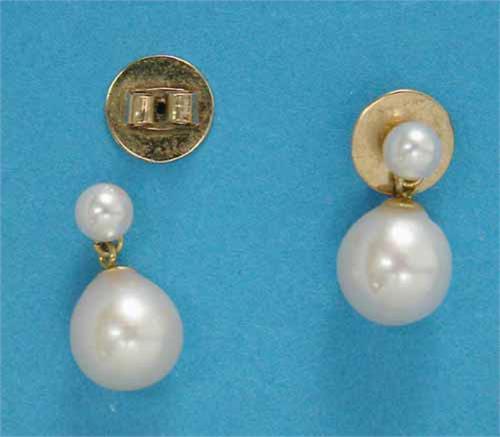 A pair of cultured pearl earrings, each with a round pearl suspended on a smaller pearl...
