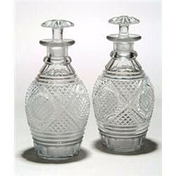 A pair of cut ovoid spirit decanters and mushroom stoppers, with a geometric pattern field of fine diamonds, 19cm high, circa 1830 (some minute chips, one with water discolouration)