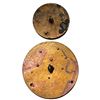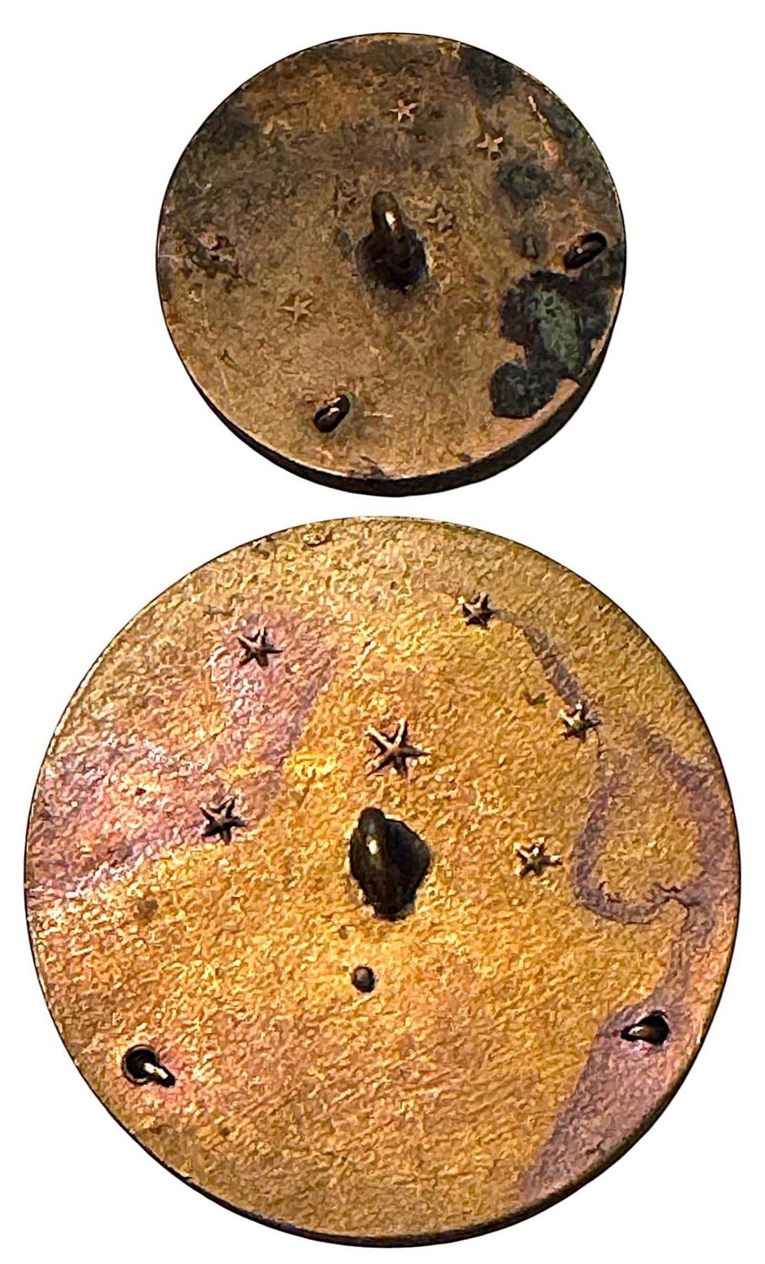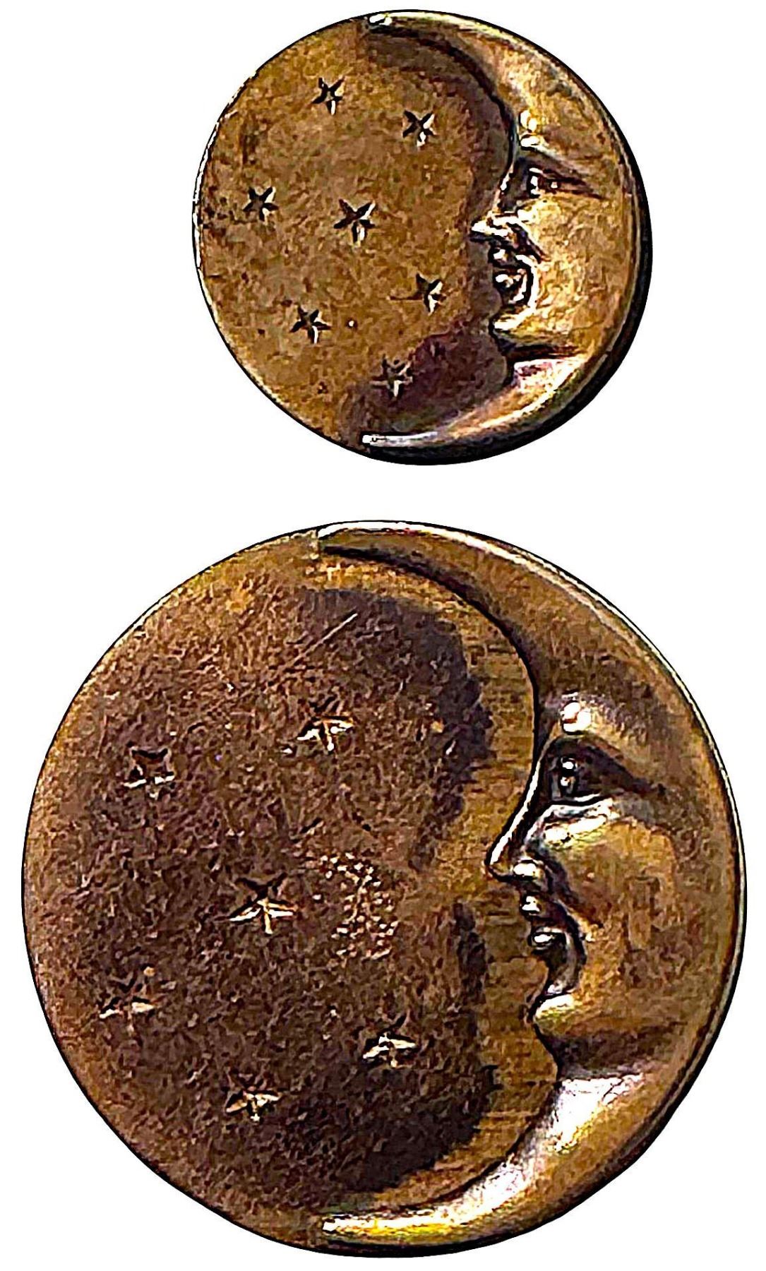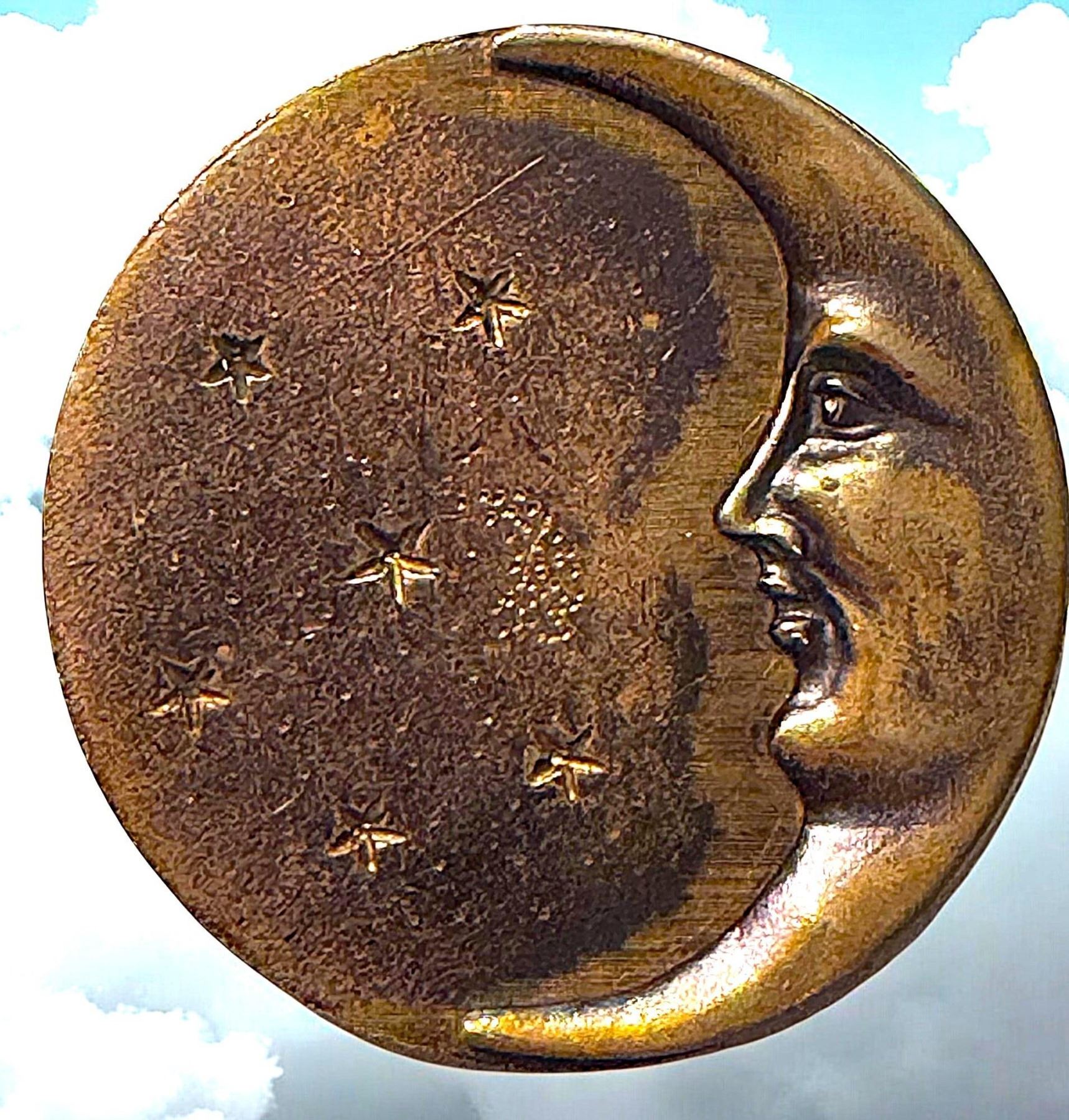 2 Medium/Large 19th C. Mother/Daughter pair of brass examples. Here we have 2 nice examples of the same button in two different sizes depicting a moon face on relief brass and stars engraved on the brass base.