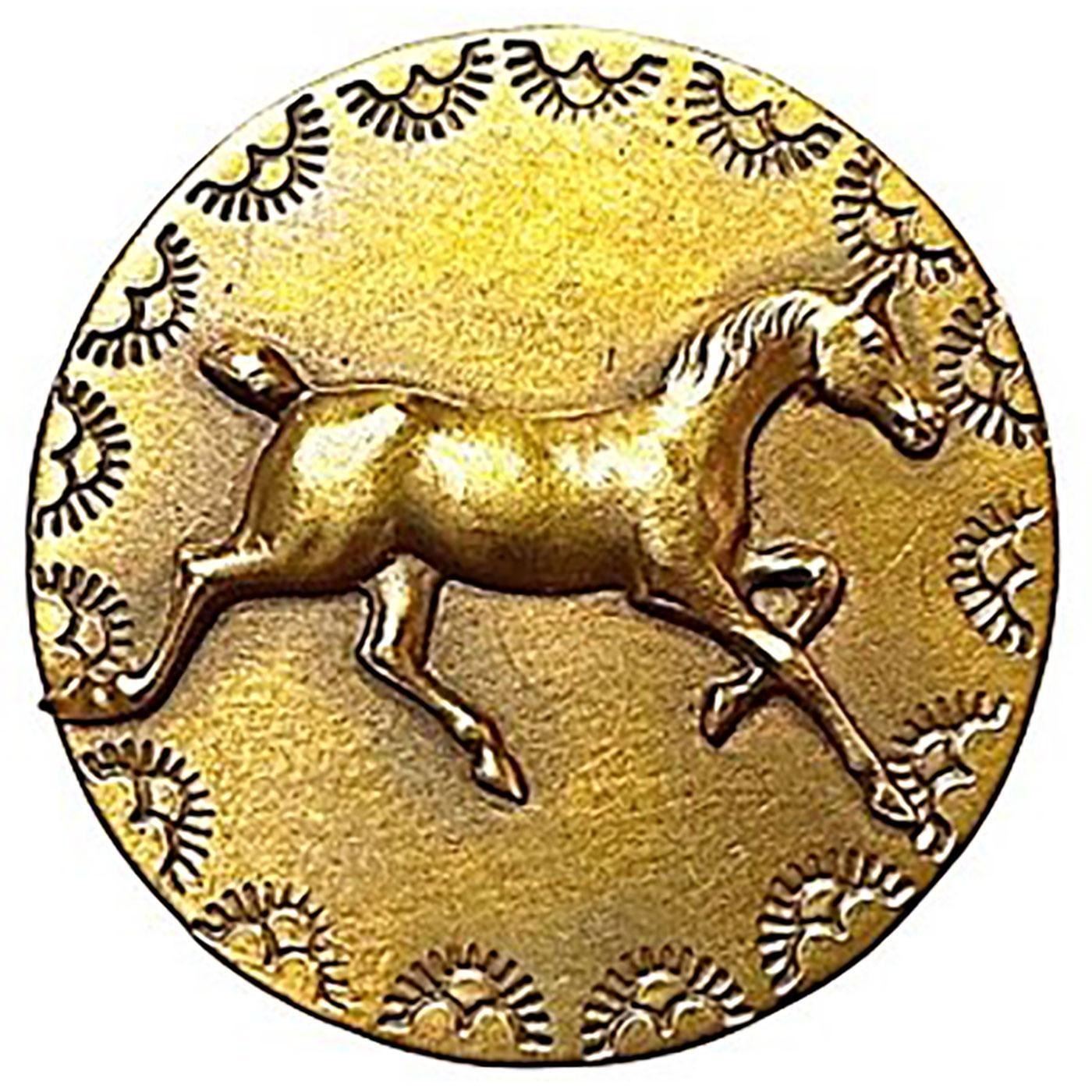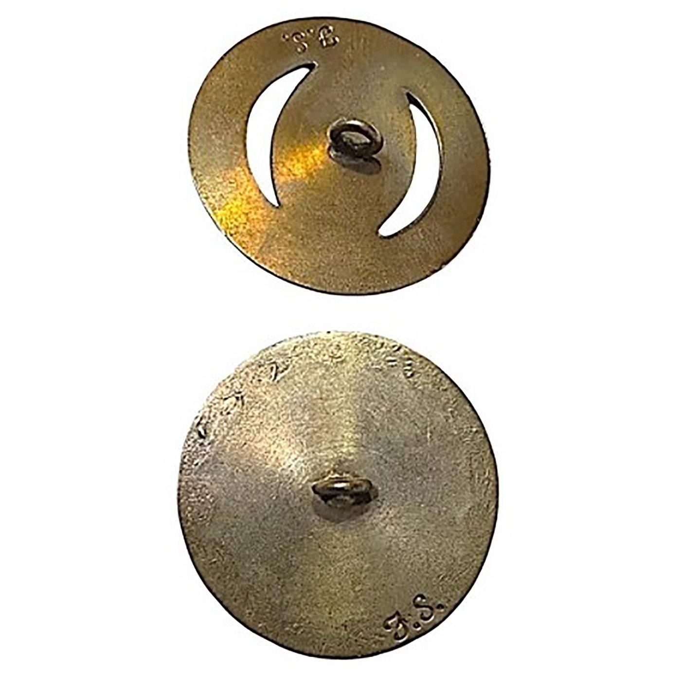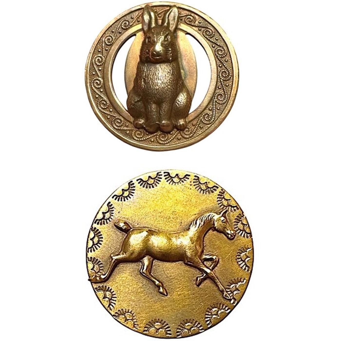 2 LG. 20th C. different Animal buttons by the late Faith Strobel. This nice selection came to us from a collector outside the button world along with several other lots. Faith was a talented and gifted artist who created these incredibly old looking style buttons in a variety of techniques. This example is very detailed in a 2 piece brass and is signed on the back FS. You might want to grab this pair up as there will no longer be any of her buttons made.?