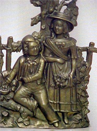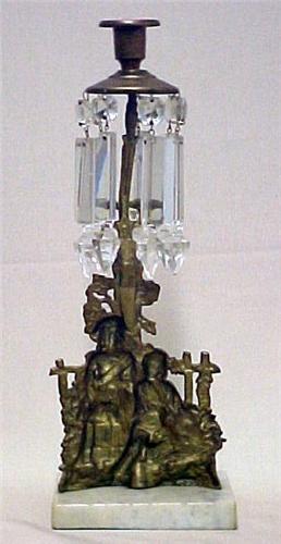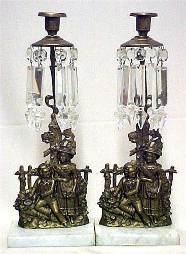 A pair of double figural girandoles; single candleholder with cut glass prisms above brass figures of boy and girl at fence; on rectangular marble base; 14" high; late 19th C. (a few chips on prisms)