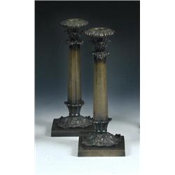 A pair of early 19th century bronze candlesticks, the foliate nozzles on gun barrel columns resting.