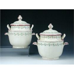 A pair of early 19th century ice pails, liners and covers, the latter domed and with mauve detailed bud knops, bands of green leaved brown vines and mauve lines painted on the shallow lobed bodies, 23cm high overall (R) (6) £1,000-1,500