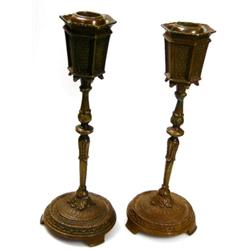 A pair of early 20th century brass candlesticks cast as street lanterns, the circular bases each on.