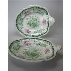 A pair of early Victorian leaf shaped dishes, possibly Davenport, printed in green and mauve within.