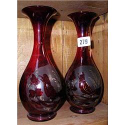 A pair of early red glass vases with bird decoration.