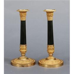 A pair of empire ormolu and patinated bronze CANDLESTICKS, 25,5 cm high; one nozzle with insignificant defect