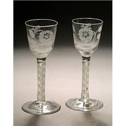 A pair of engraved opaque-twist wine glasses of Jacobite significance, the ogee bowls with a rose bud and flower and a bird in flight, supported on double series stems and conical feet, 15cm high, circa 1770 (some ingrained dirt in the stems) (see illustration) £600-800