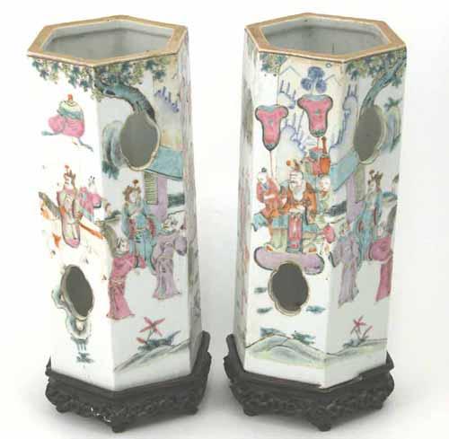 A pair of 'famille rose' lanterns, hexagonal shape with pierced sides, painted with figures at various outdoor pursuits (10.5in.), on carved wood stands £100-150