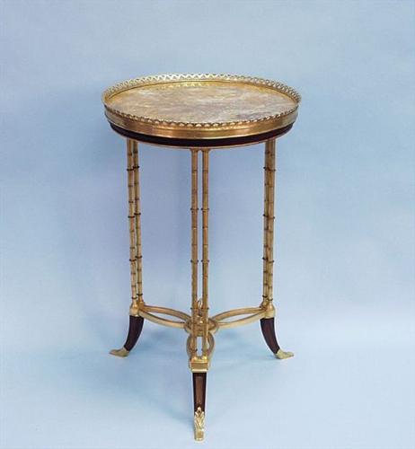 A pair of fine French Empire style gilt bronze circular tables. The gilt bronze stylized bamboo design legs joined by triangular bronze stretchers. Fitted circular marble top with gilt bronze gallery. Top 19" diameter 30 1/2" high.