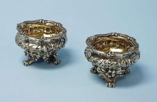 A pair of fine antique English sterling silver salts. The globular shaped bowls raised on tripod feet decorated with relief scrolls. Fully marked for London, 1841. 3000-3500