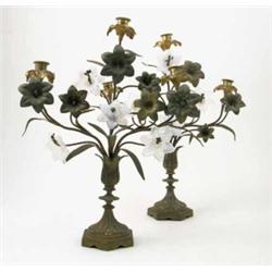 A pair of foliate brass table candelabrum, each with three gilt metal branches, four opaque glass...