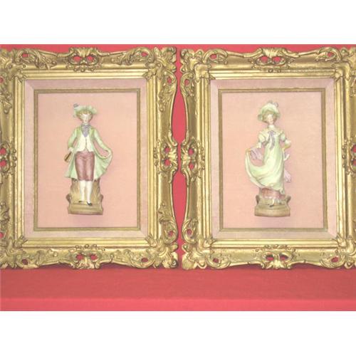 We are offering these beautiful Porcelain figurine in nice and antique Gold leaf over Wood Frame in good condition(just little lost on Frame) . Frame H:18.50" - W:15.50" and Figurine's H:10" .