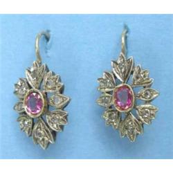 A pair of gold pierced work earrings, each set with an oval ruby in a flowerhead border of rose cut diamonds £300-500