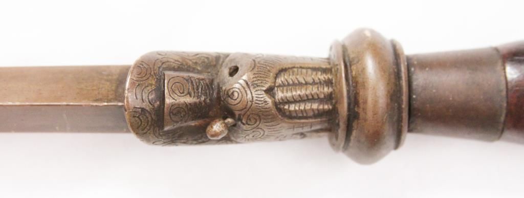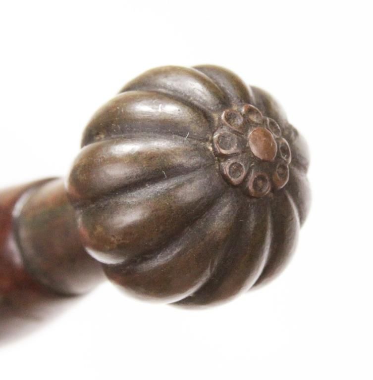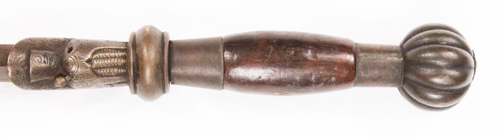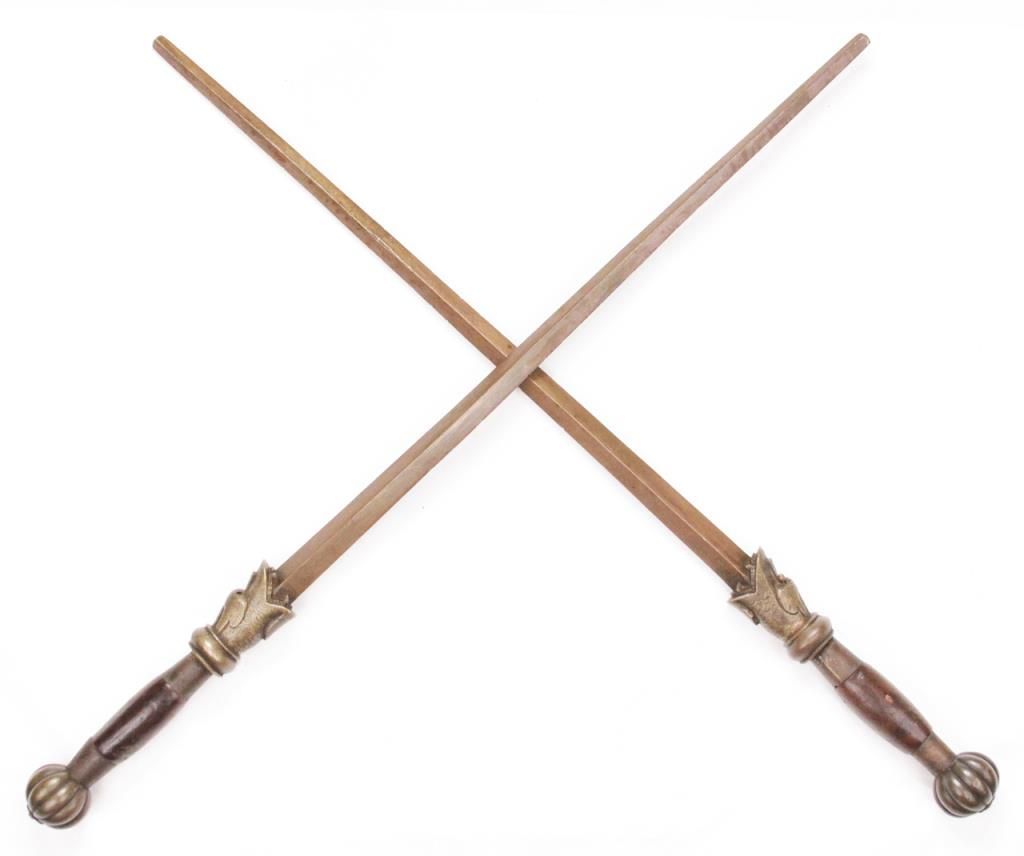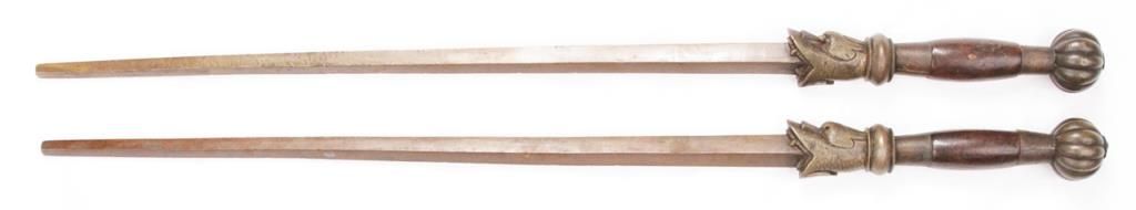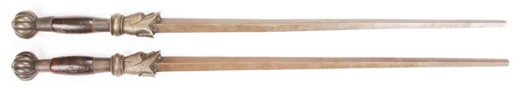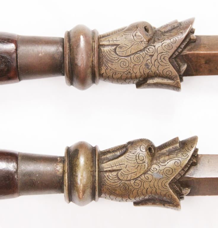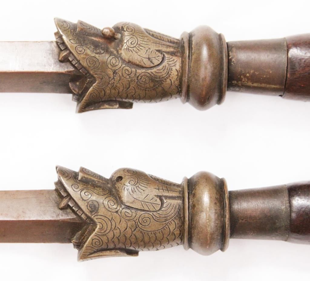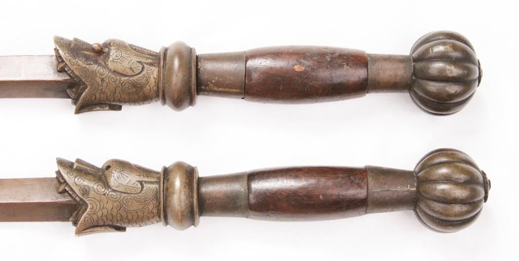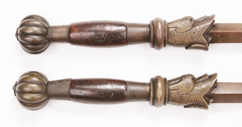 A pair of heavy Qing dynasty brass bar maces. Hardwood handle with a ribbed ball shaped pommel. Heavy four sided brass blade projects from the mouth of a dragon and tapers towards the tip. Dragon heads originally had movable protrudingeyes, now missing (one remains). 19th century. Good condition, minor wear to handles and some use dents to blades. Measures 27”. Est.: $450-$550.