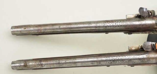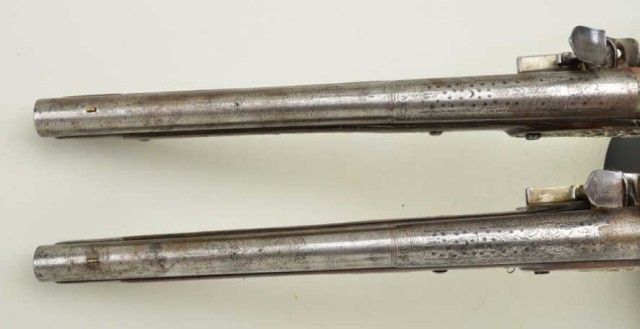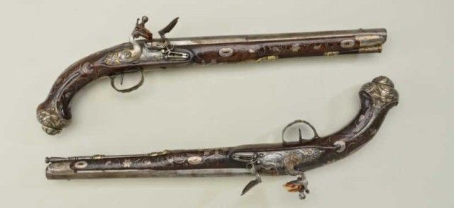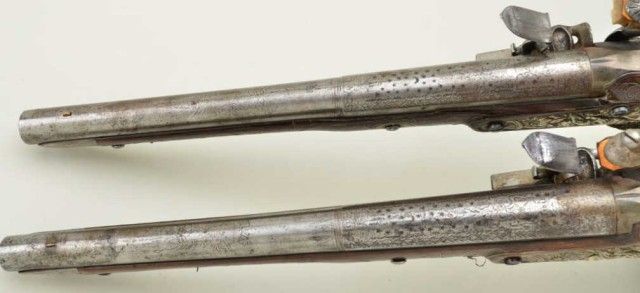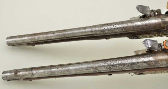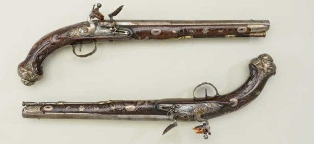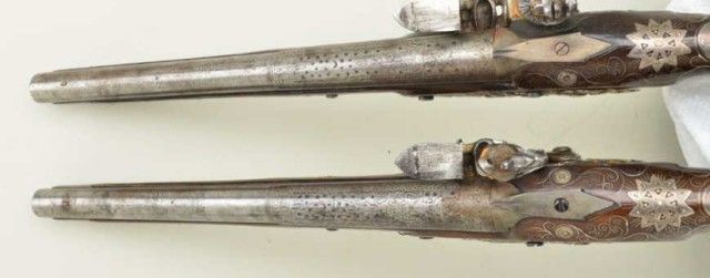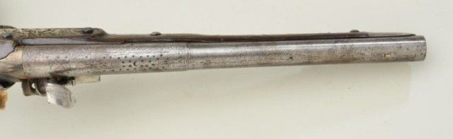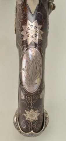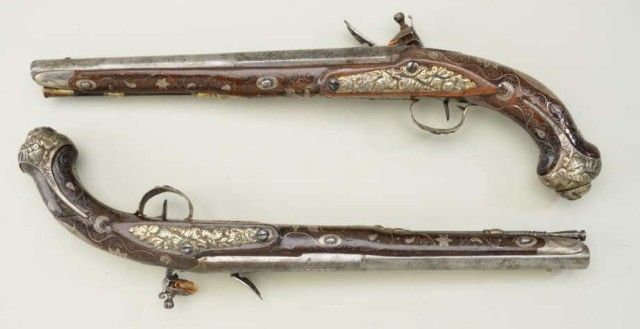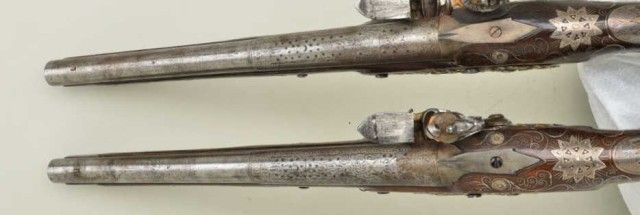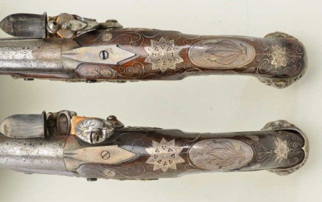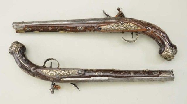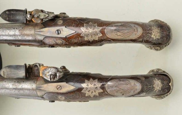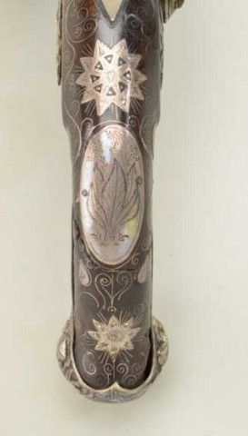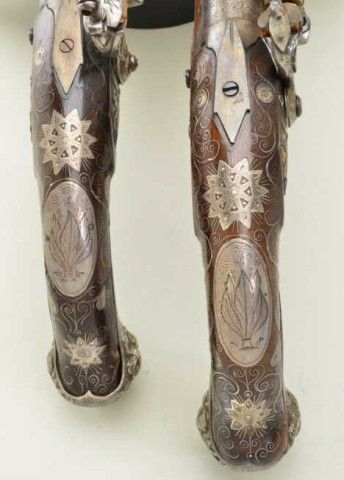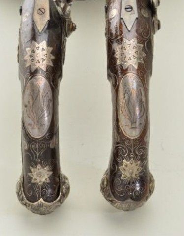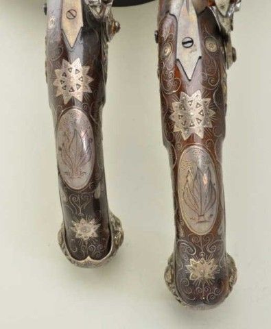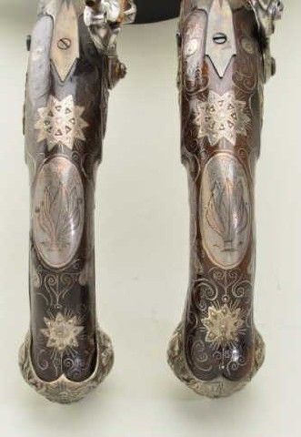 A pair of high quality French Flintlock High Art Holster size Pistols, locks are inscribed “ VERGNER a MARSEILLE” . The pistols measure 19” overall with 12-1/2” barrels, approx 62 cal smooth bore. The locks arechiseled with engraved borders and the barrels are also lightly engraved. The mounts are hallmarked silver and cast in high relief. The stocks are silver wire and plaque inlayed. The plaques are nicely handengraved, the largest plaque at the wrist shows a fan of what may be tobacco leaves and were thought to be an Egyptian crest. The metal is in good condition, showing a light rust. The stock shows some small losses and a light coating of varnish. A superior pair of European Arms made for trade and we would date them about 1800-1830. Est.; $4,000-$8,000