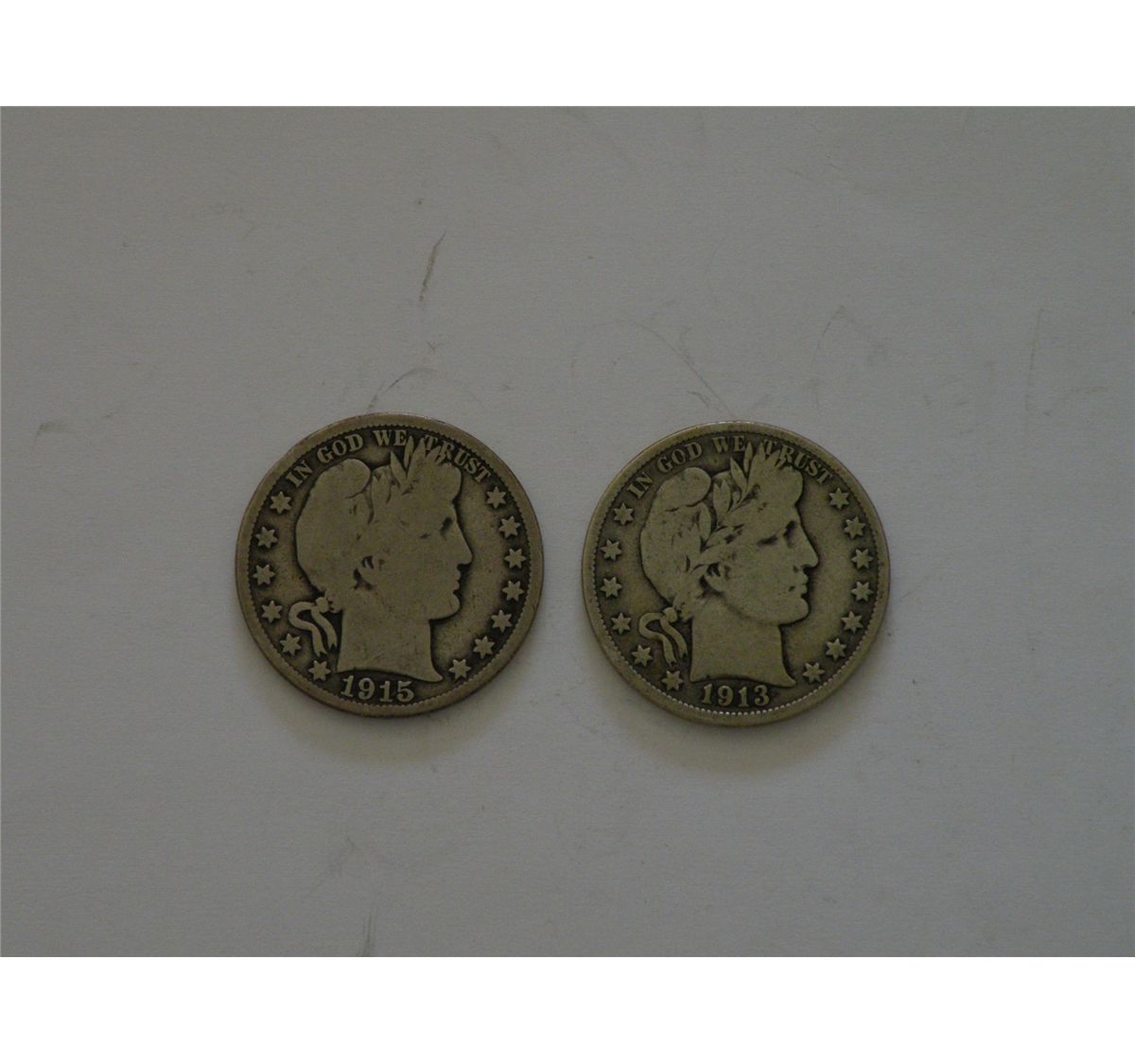 A pair of key date Barber Half Dollars: 1913 VG and defect- free; 1915 Abt. VG, full rims. A total of 2 coins. Est$140