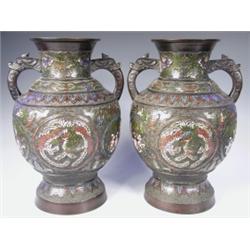 A pair of l9th Century Japanese bronze vases with champleve enamel decoration signed square seal mark to underside, 36cm high