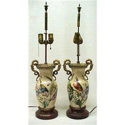 A pair of lamps, each with gilt metal dragon handles and pierced trim on fitting, over polychrome bird and floral enameling on crackle ground, round wooden bases, each with two lights, urn finials, 15" to top of dragon handles, early 20th C.