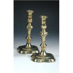 A pair of late 18th century brass candlesticks, the vase nozzles with flared rims above baluster and knopped stems, the square feet scalloped, 18.5cm high (2) £150-200