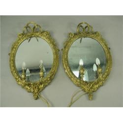 A pair of late 19th Century oval wall mirrors, the gilded gesso frames with ribbons and flowers each with a pair of candle brackets, 74cm high