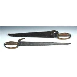 A pair of late 19th century Chinese swords in common scabbard, each wood handle carved on the rounded side with a frame of flowers, the flat sides meeting so that the two single edged blades can fit into the leather scabbard, the bronze guards running below the handles into downswept quillons, 50cm long overall (3) £80-120