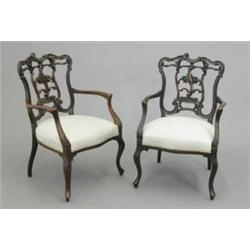 A pair of late 19th century mahogany elbow chairs, with pierced foliate carved splats and silk up...