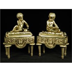 A pair of late 19th/early 20th century French gilt bronze chenets, each with a cherub on a tassel...