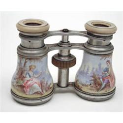 A pair of late Victorian aluminium opera glasses, the barrels enamelled with a man and woman seated amidst woodland in Watteau style, mother o'pearl eye pieces (see illustration) £100-150
