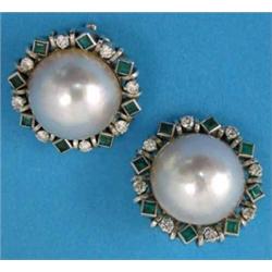 A pair of mabe pearl, emerald and diamond earclips, each pearl within a border of square-cut emeralds alternating with round cut diamonds £300-500