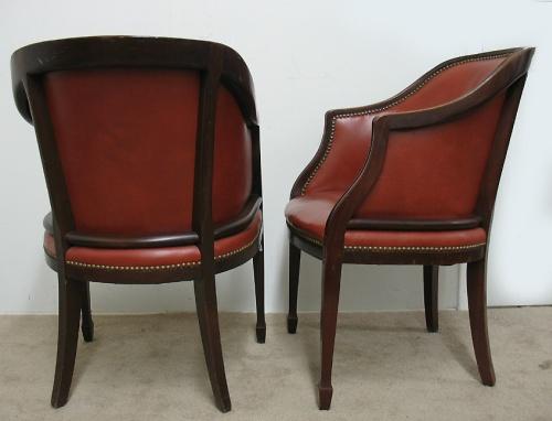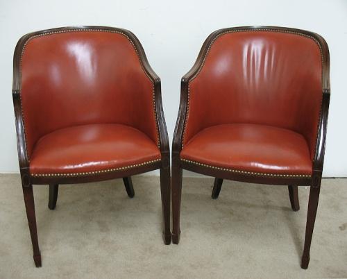 A pair of mahogany and leather upholstered club chairs; mahogany crest rail over brass tack; trim; sienna brown leather seat and back; square tapered legs with front legs terminating in spade feet; mid 20th C.; measures 34 1/2" high x 22 1/4" across x 23" deep (no visible defects)