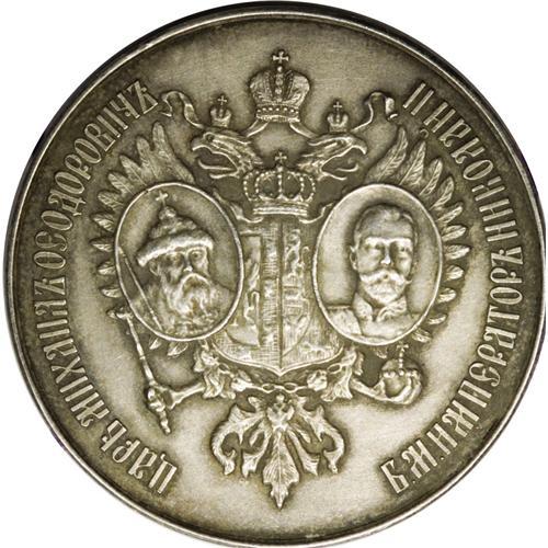 <B>A pair of medals, silver and gold, on the 300th Anniversary of the Romanov Dynasty 1913,</B></I> Czar Michael Federovich and Nicholas II in small ovals over the Imperial eagle/163-1913 within a branch, and on a scroll in Russian, TO THE SUCCESSFUL ONE , the gold medal is 32 mm, matte UNC in the original case with a few scratches and rim bumps, the silver medal is 42 mm, matte AU with no case.<BR><BR><b>Shipping:</b> Coin/Currency (<a target="_blank" href="http://www.heritageauctions.com/common/shipping.php">view shipping information</a>)