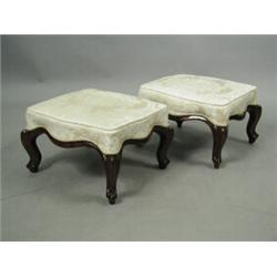 A pair of mid Victorian walnut footstools, the gold damask seats of serpentine outline on moul...