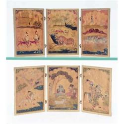 A pair of miniature bone 3-leaf folding screens, probably Indian, painted and gilded with mythological figures and animals, adjustable in gilt-metal frames, leaves 2.5ins x 1.75ins £200-300