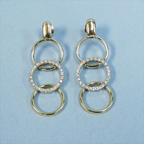 A pair of modernist 18 kt. yellow gold and diamond earrings designed as three circles attached to a rectangular earpiece. Hallmarked. Matching the lot above.