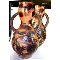 A pair of mottled brown two handled vases, the baluster bodies incised with stylised rosettes amongst foliage on each side, the treacle brown mottling on an ochre ground, impressed marks, 37cm high (2) £100-150